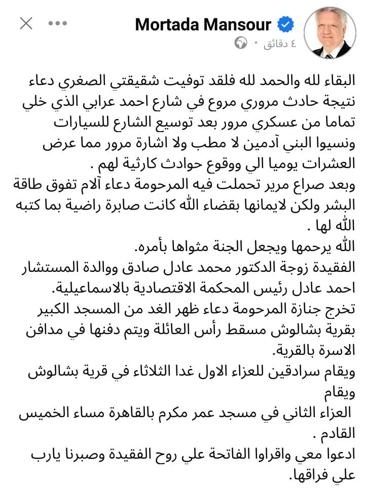 وكتب مرتضى عبر حسابه: البقاء لله والحمد لله فلقد توفيت شقيقتي الصغري دعاء نتيجة حادث مروري مروع في شارع احمد عرابي الذي خلي تماما من عسكري مرور بعد توسيع الشارع للسيارات ونسيوا البني آدمين لا مطب ولا اشارة مرور مما عرض العشرات يوميا الي ووقوع حوادث كارثية لهم.