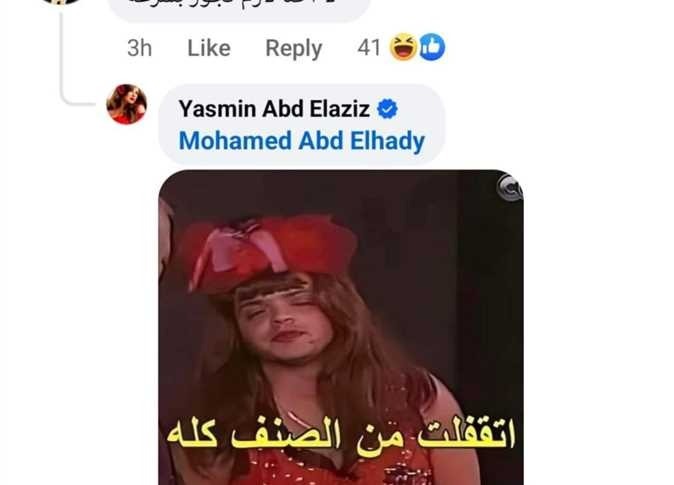 وسرعان ما ردّت عليه ياسمين  بشكل ساخر بصورة للفنان محمد هنيدي على طريقة “الكوميك” مكتوب عليها: “اتقفلت من الصنف كله”.