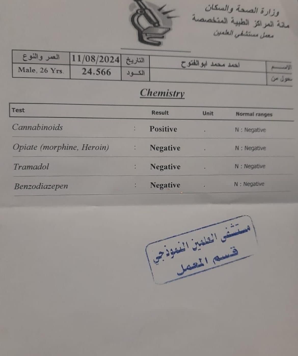 وكشفت التقرير إيجابية تحليل المخدرات لمخدر الحشيش في عينة اللاعب بعد إلقاء القبض عليه.