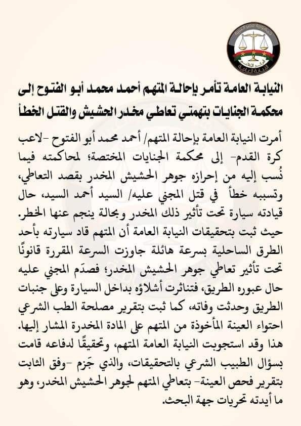 أمرت النيابة العامة بإحالة لاعب كرة القدم بنادي الزمالك أحمد محمد أبو الفتوح، وشهرته أحمد فتوح، إلى محكمة الجنايات، لاتهامه بإحراز جوهر الحشيش المخدر بقصد التعاطي، وتسببه خطأ في قتل المجني عليه السيد أحمد السيد، حال قيادته سيارة تحت تأثير ذلك المخدر وبحالة ينجم عنها الخطر.
