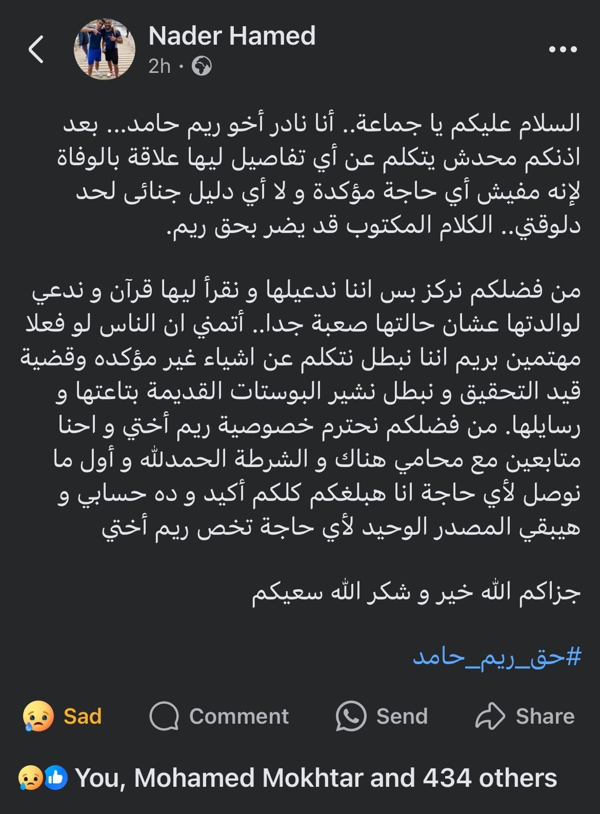 قال : “من فضلكم نركز بس إننا ندعيلها ونقرأ ليها قرآن وندعي لوالدتها عشان حالتها صعبة جدا.. أتمني ان الناس لو فعلا مهتمين بريم إننا نبطل نتكلم عن أشياء غير مؤكدة وقضية قيد التحقيق ونبطل نشير البوستات القديمة بتاعتها ورسايلها.. من فضلكم نحترم خصوصية ريم أختي واحنا متابعين مع محامي هناك والشرطة الحمد لله.. وأول ما نوصل لأي حاجة انا هبلغكم كلكم أكيد وده حسابي وهيبقي المصدر الوحيد لأي حاجة تخص ريم أختي”.