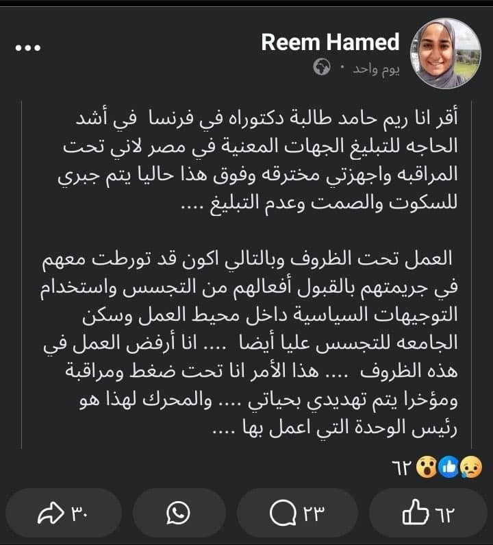 كتبت ريم حامد أنها تتعرض لأشياء غريبة ومريبة مثل مراقبتها طوال الوقت سواء من أشخاص بعينهم أو عن طريق التجسس على أجهزتها، ويتم تهديدها على السكوت عن أمر ما يخص أبحاثها وطبيعة عملها في فرنسا ملمحة لمسؤولية شخص ما يعمل معها في جهة عملها وراء ذلك.