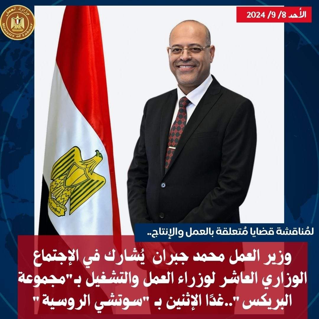 يُشارك محمد جبران، وزير العمل، خلال اليومين المُقبلين “الإثنين والثلاثاء”،فى أعمال الاجتماع الوزاري العاشر للوزراء العمل والتشغيل التابع لمجموعة البريكس، والمُقرر عقده بسوتشي الروسية ،وذلك بدعوة رسمية من وزير العمل والحماية الاجتماعية الروسية، لمناقشة العديد من الملفات المُتعلقة بالعمل والإنتاج.