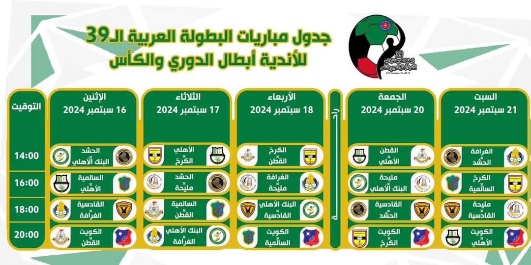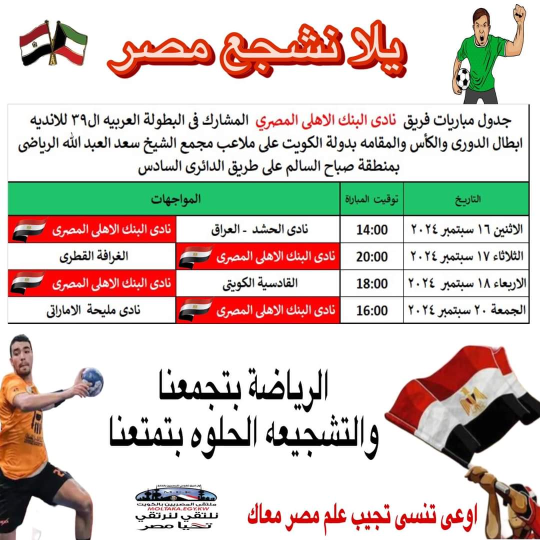 اعلن هاني كمال عضو اتحاد شباب المصريين بالخارج بدولة الكويت ، عن اقتراب منافسات انطلاق منافسات البطوله العربيه لكرة اليد ال 39 للاندية ابطال الدورى والكأس والمقامه بدولة الكويت على ملاعب مجمع الشيخ سعد العبد الله الرياضى بمنطقة صباح السالم على الدائرى السادس .