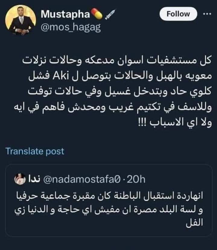 استغاث أهالي أسوان من خلال منشورات على مواقع التواصل الإجتماعي قائلين “الحقونا احنا بنموت”، كما أكدوا على زيادة أعداد الحالات المصابة، كما طالبوا وزارة الصحة بسرعة كشف السبب حيث أنهم مبهم حتى الآن.