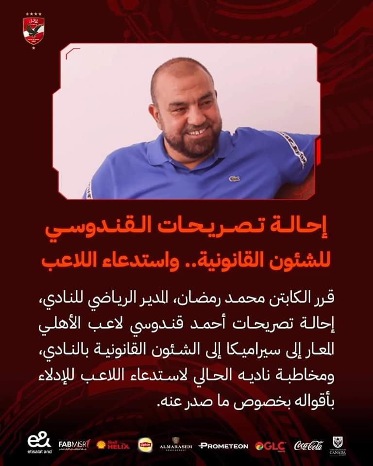 قرر محمد رمضان، المدير الرياضي الجديد للنادي الأهلي، إحالة تصريحات أحمد القندوسي، لاعب الأهلي المعار إلى سيراميكا، إلى الشئون القانونية بالنادي.