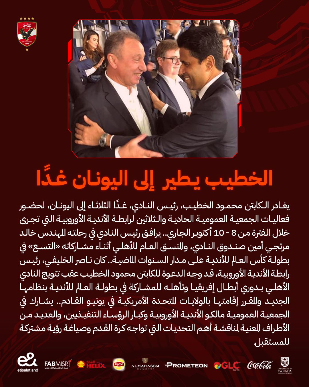 يغادر الكابتن محمود الخطيب، رئيس النادي، غدًا الثلاثاء إلى اليونان، لحضور فعاليات الجمعية العمومية الحادية والثلاثين لرابطة الأندية الأوروبية التي تجرى خلال الفترة من 8 – 10 أكتوبر الجاري.