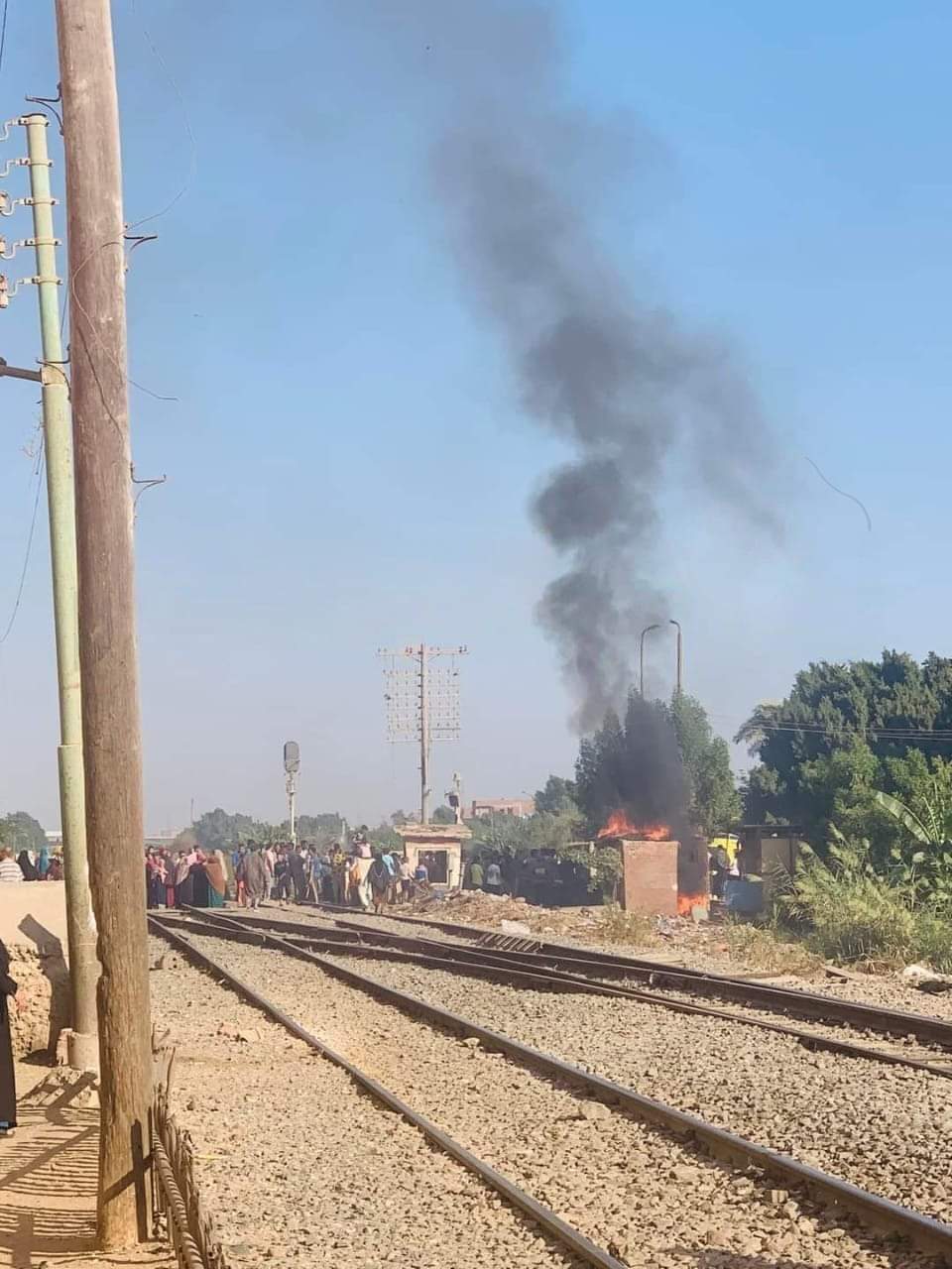 وفى تمام الساعة 8.30 صباحاً تأشر من ناظر المحطة تجمهر الأهالي علي المنفذ وقيامهم بالتعدي علي خفير المنفذ وإشعال النيران بغرفة غفير المنفذ وتم حجز القطارات طالع / نازل.