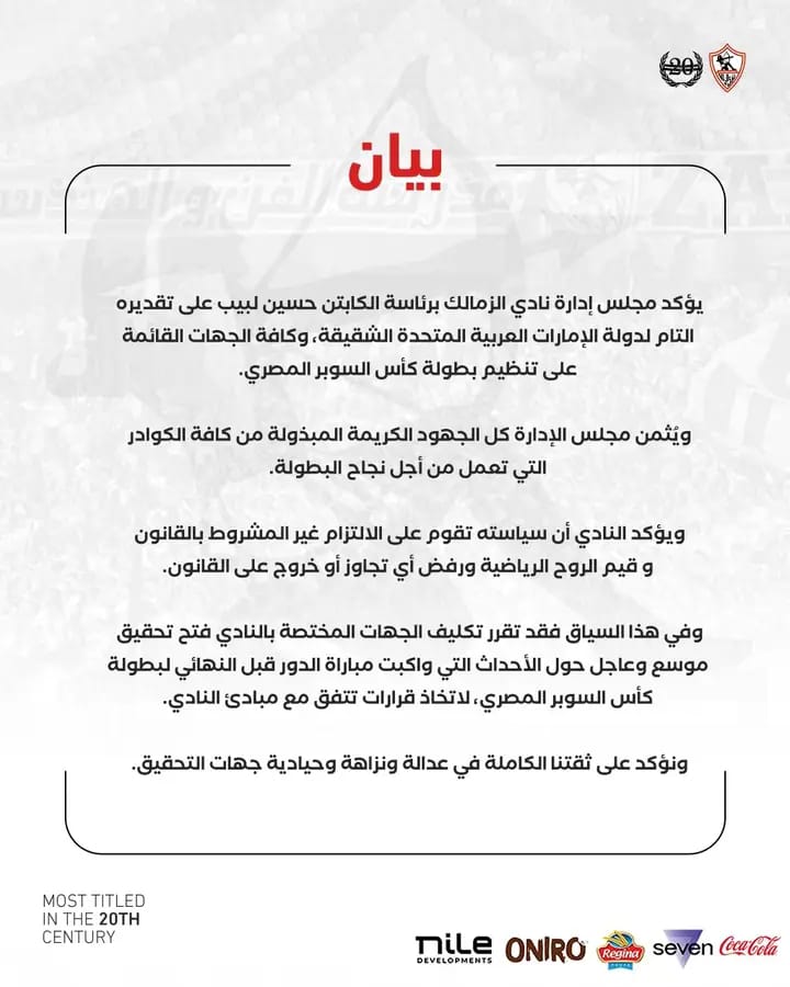 يؤكد مجلس إدارة نادي الزمالك برئاسة الكابتن حسين لبيب على تقديره التام لدولة الإمارات العربية المتحدة الشقيقة، وكافة الجهات القائمة على تنظيم بطولة كأس السوبر المصري.