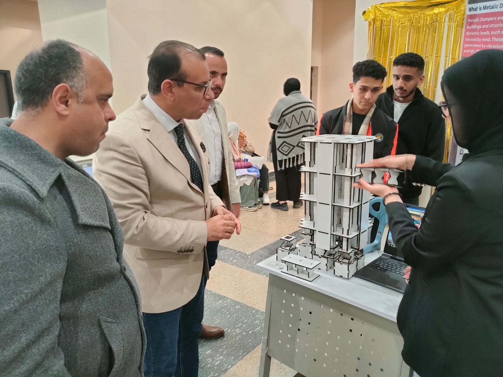 و قد اضاف ا.د وائل صديق عميد الكليه بان اليوم العلمي قد تميز بعرض مجسمات هندسية مبتكرة تمثل الوسائل المختلفة لمقاومة الزلازل، والتي شملت: