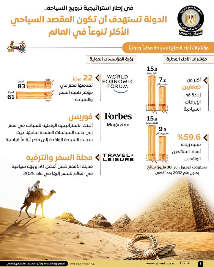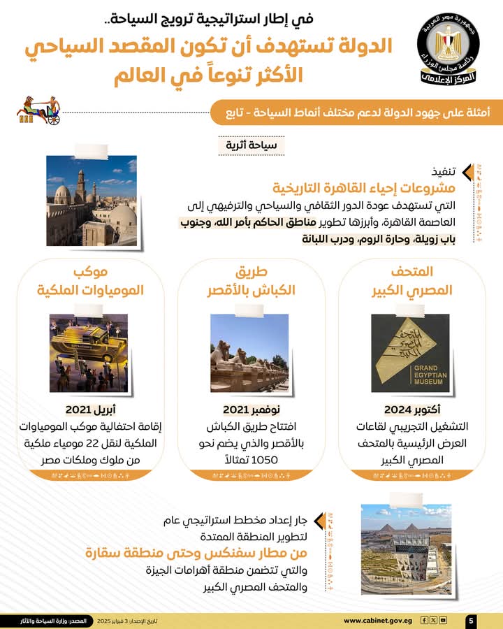 وفي هذا الصدد، نشر المركز الإعلامي لمجلس الوزراء، تقريرًا تضمن إنفوجرافات تسلط الضوء على مستهدفات الدولة لتصبح المقصد السياحي الأكثر تنوعًا في العالم، وذلك في إطار استراتيجية ترويج السياحة.