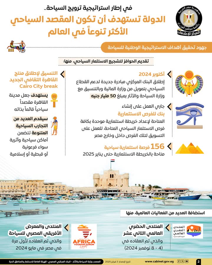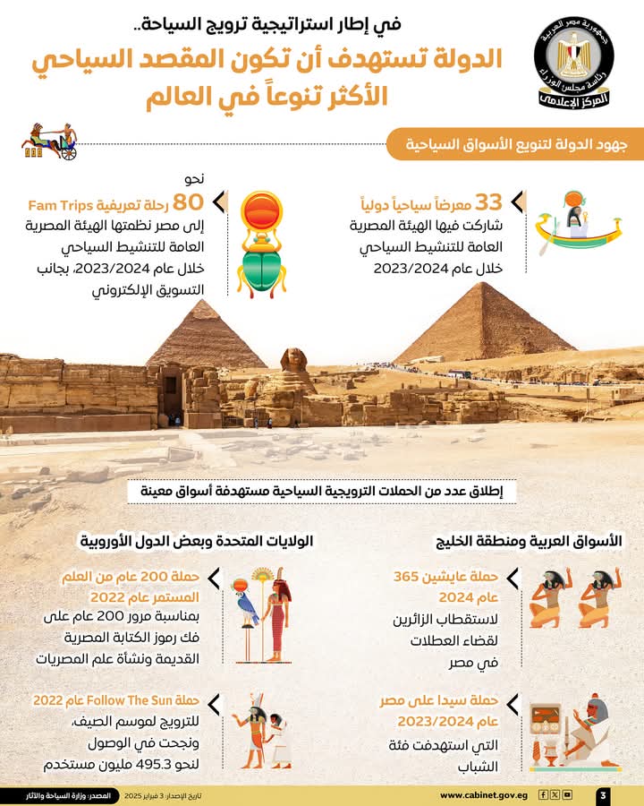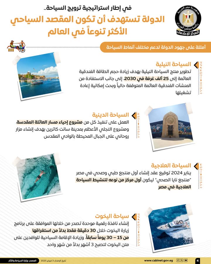 وفي هذا الصدد، نشر المركز الإعلامي لمجلس الوزراء، تقريرًا تضمن إنفوجرافات تسلط الضوء على مستهدفات الدولة لتصبح المقصد السياحي الأكثر تنوعًا في العالم، وذلك في إطار استراتيجية ترويج السياحة.