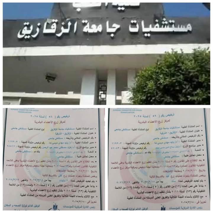 أعلنت اللجنة العليا لزراعة الأعضاء بوزارة الصحة والسكان، عن تجديد تراخيص مراكز زراعة الأعضاء بالمستشفى الجامعي، بعد استيفاء كافة المعايير والاشتراطات الطبية المطلوبة، ويأتي ذلك في إنجاز جديد يعكس التطور المستمر لمستشفيات جامعة الزقازيق.