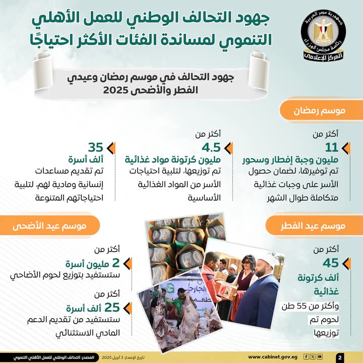 كما تناول المركز الإعلامي لمجلس الوزراء، جهود التحالف الوطني في شهر رمضان وعيد الفطر، وكذلك استعداداته لعيد الأضحى المقبل، ففيما يتعلق بموسم رمضان، وفر التحالف أكثر من 11 مليون وجبة إفطار وسحور، كما وزع أكثر من 4.5 مليون كرتونة مواد غذائية، لتلبية احتياجات الأسر من المواد الغذائية الأساسية، فيما يٌقدم مساعدات إنسانية ومادية لـ 35 ألف أسرة، وبالنسبة لموسم عيد الفطر، فقد تم توزيع أكثر من 45 ألف كرتونة غذائية وأكثر من 55 طنًا من اللحوم، وبشأن موسم عيد الأضحى، فإن هناك أكثر من مليوني أسرة ستستفيد بتوزيع لحوم الأضاحي، وأكثر من 25 ألف أسرة ستستفيد من تقديم الدعم المادي الاستثنائي.