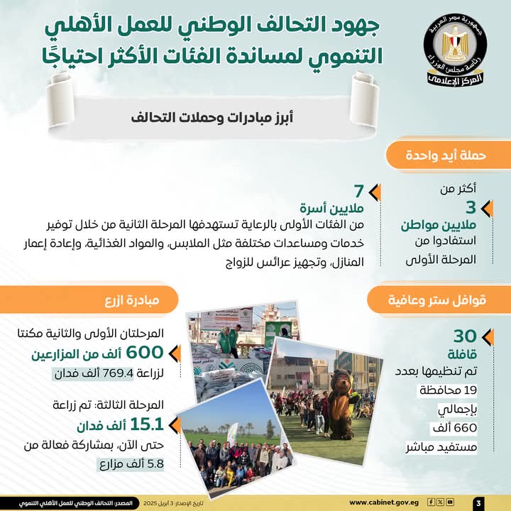 ولفت المركز الإعلامي لمجلس الوزراء إلى أبرز مبادرات وحملات التحالف الوطني، ومن بينها حملة “أيد واحدة”، والتي استفاد من المرحلة الأولى منها أكثر من 3 ملايين مواطن، فيما تستهدف المرحلة الثانية 7 ملايين أسرة من الفئات الأولى بالرعاية، من خلال توفير خدمات ومساعدات مختلفة، مثل: الملابس والمواد الغذائية وإعادة إعمار المنازل وتجهيز عرائس للزواج، أما مبادرة “ازرع” فقد مكنت المرحلتان الأولى والثانية منها 600 ألف من المزارعين لزراعة 769.4 ألف فدان، بينما تم زراعة 15.1 ألف فدان حتى الآن بالمرحلة الثالثة من المبادرة، بمشاركة فعالة من 5.8 ألف مزارع، وعلى صعيد “قوافل ستر وعافية”، فقد تم تنظيم 30 قافلة من قوافل ستر وعافية بـ 19 محافظة بإجمالي 660 ألف مستفيد مباشر.