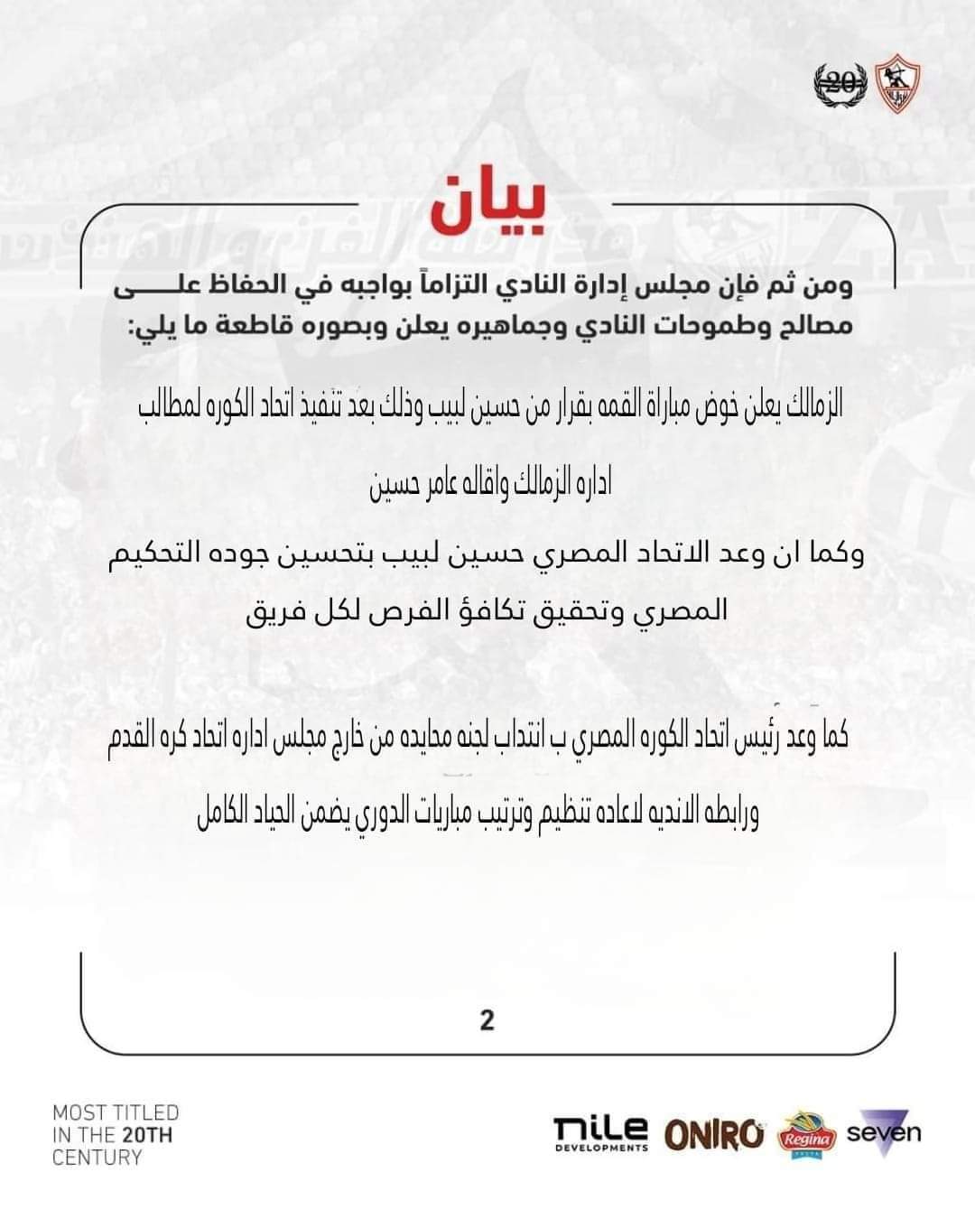 قرر نادى الزمالك خوض مباراة القمة أمام النادي الأهلي غدا الثلاثاء باستاد القاهرة
