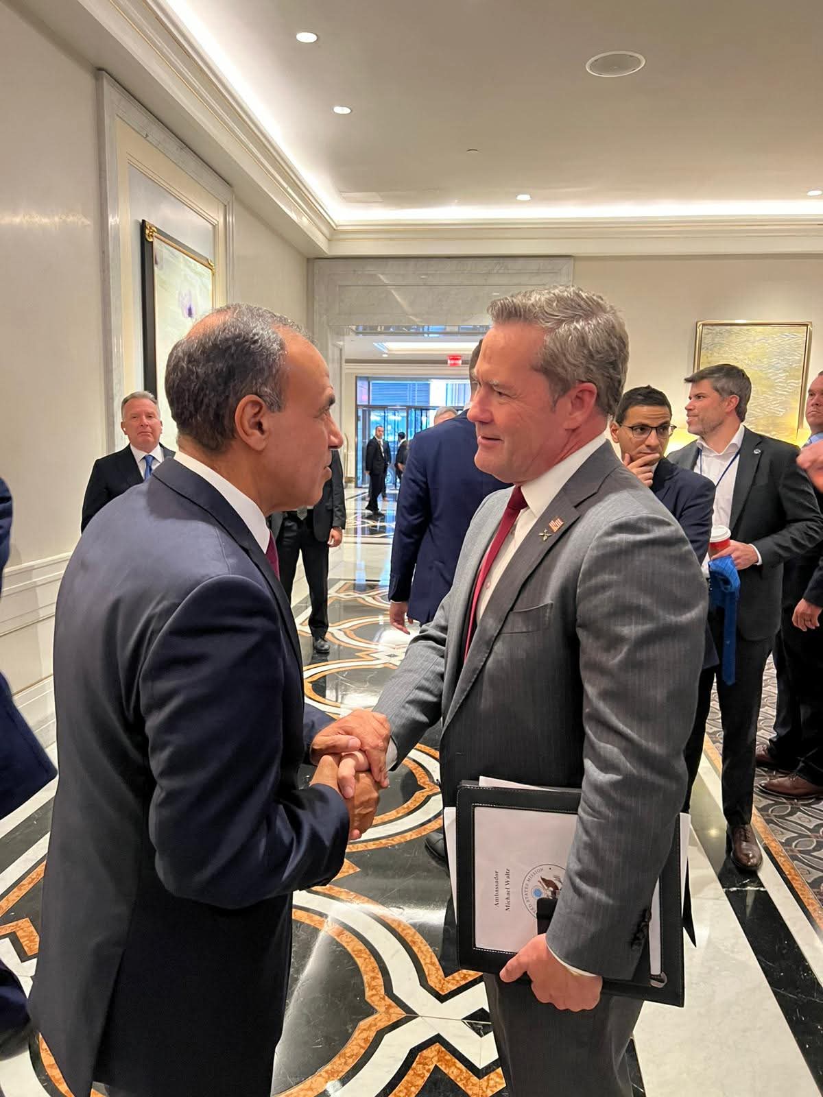 التقى د. بدر عبد العاطي وزير الخارجية والهجرة وشئون المصريين في الخارج، “مايكل والتز” المندوب الدائم الأمريكي لدى الأمم المتحدة ومستشار الأمن القومي الأمريكي السابق، وذلك على هامش أعمال الشق رفيع المستوى للجمعية العامة للأمم المتحدة.