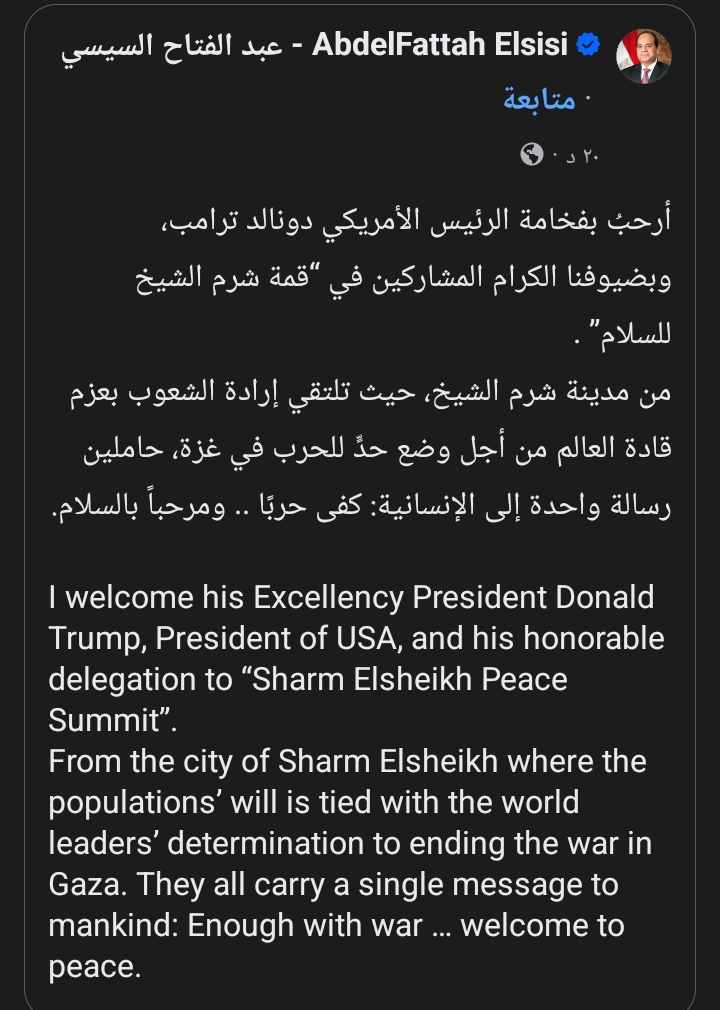 رحب الرئيس عبد الفتاح السيسي بمشاركة الرئيس الأمريكي في قمة شرم الشيخ، حيث كتب على صفحته الرسمية على موقع التواصل الاجتماعي فيس بوك:” أرحبُ بفخامة الرئيس الأمريكي دونالد ترامب، وبضيوفنا الكرام المشاركين في “قمة شرم الشيخ للسلام” .. من مدينة شرم الشيخ، حيث تلتقي إرادة الشعوب بعزم قادة العالم من أجل وضع حدٍّ للحرب في غزة، حاملين رسالة واحدة إلى الإنسانية: كفى حربًا .. ومرحباً بالسلام”.