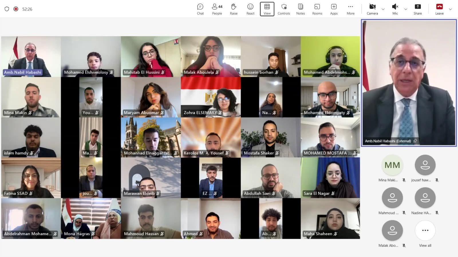 في إطار حرص الحكومة المصرية على تعزيز التواصل مع أبنائها في مختلف دول العالم، وفي ضوء الأهمية التي توليها لرعاية أبنائها من الشباب فى الخارج وربطهم بوطنهم الأم وتعزيز روح الانتماء لديهم، عقد السفير نبيل حبشي نائب وزير الخارجية والهجرة وشئون المصريين بالخارج لقاءً افتراضياً مع مجموعة من الشباب المصريين الدارسين بالخارج فى عدد من الدول ومنها فرنسا وروسيا وايطاليا والمملكة المتحدة واستراليا وغيرها أعضاء شبكة YENA وهى الشبكة المخصصة لربط شباب المصريين الدارسين بالخارج وتضم عدد كبير من شباب الباحثين والطلاب المصريين المتميزين في مختلف التخصصات.