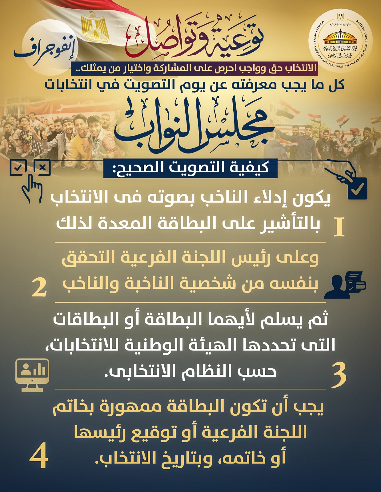 أصدرت وزار الشؤون النيابية والقانونية والتواصل السياسي بيانًا قالت فيه إنه استمرارًا لسلسة توعية وتواصل التي تصدرها الوزارة بالتزامن مع انتخابات مجلس النواب، نشرت اليوم سلسلة جديدة بعنوان “توعية وتواصل.. الانتخاب حق وواجب احرص على المشاركة واختيار من يمثلك.. كل ما يجب معرفته عن يوم التصويت في المرحلة الثانية من انتخابات مجلس النواب”.
