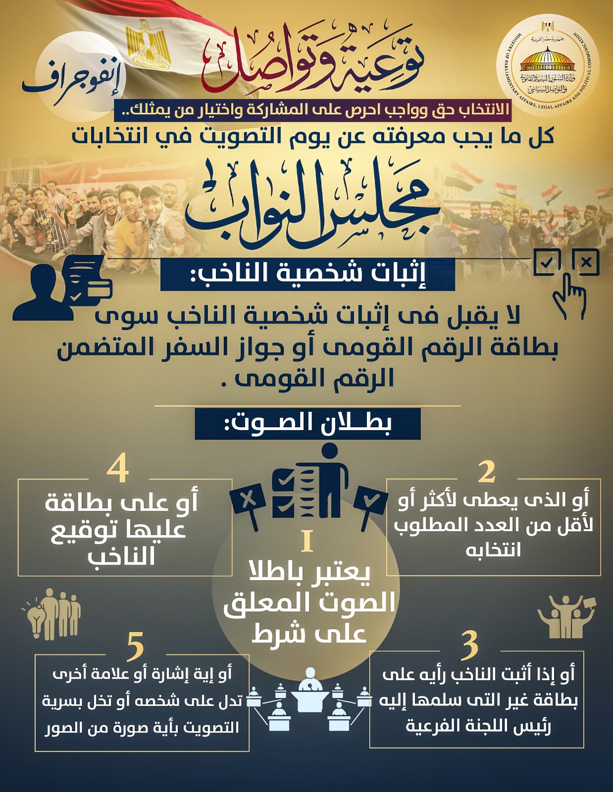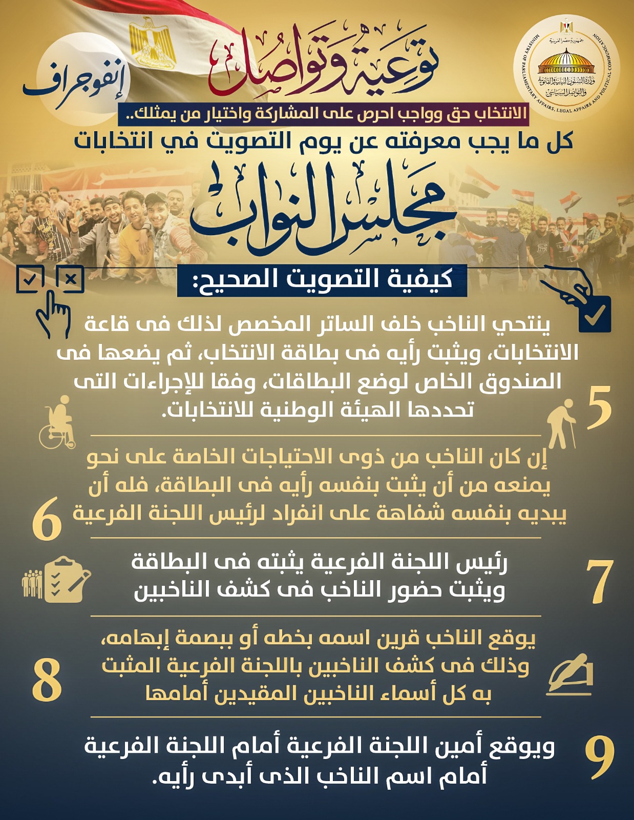 أصدرت وزار الشؤون النيابية والقانونية والتواصل السياسي بيانًا قالت فيه إنه استمرارًا لسلسة توعية وتواصل التي تصدرها الوزارة بالتزامن مع انتخابات مجلس النواب، نشرت اليوم سلسلة جديدة بعنوان “توعية وتواصل.. الانتخاب حق وواجب احرص على المشاركة واختيار من يمثلك.. كل ما يجب معرفته عن يوم التصويت في المرحلة الثانية من انتخابات مجلس النواب”.