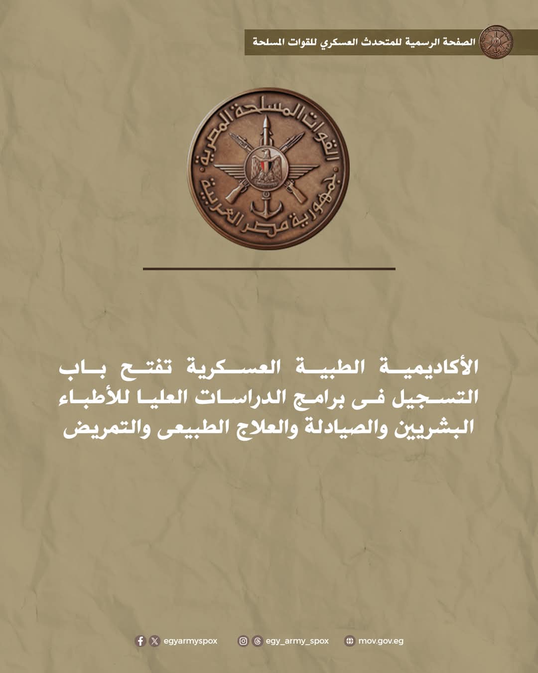 على أن يكون التسجيل بمقر الأكاديمية الطبية العسكرية إعتباراً من 15 / 01 / 2026 ولمدة شهر .