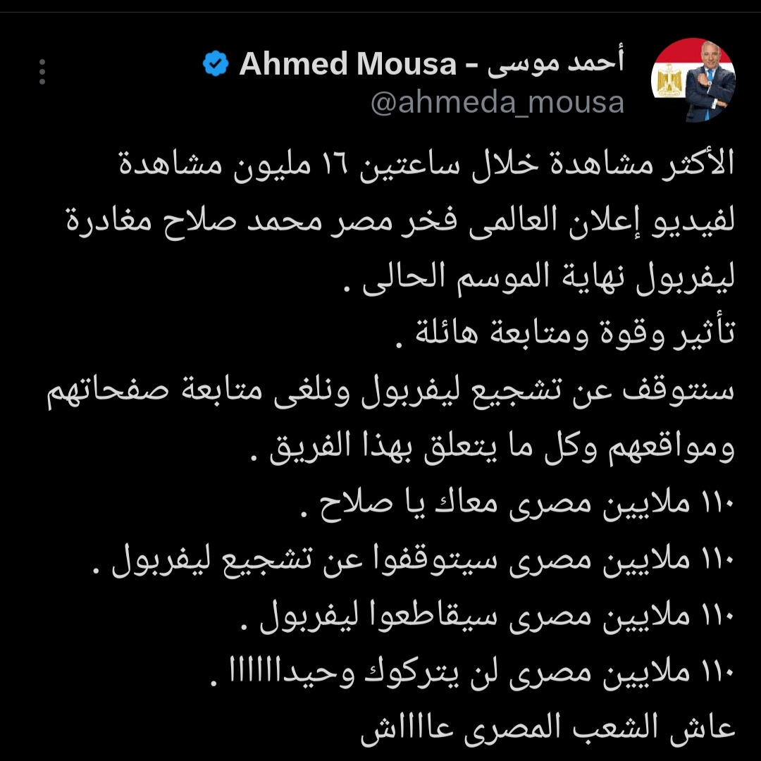 وقال موسى في تصريحاته: “سنتوقف عن تشجيع ليفربول ونلغى متابعة صفحاتهم ومواقعهم وكل ما يتعلق بهذا الفريق. 110 ملايين مصري معاك يا صلاح. 110 ملايين مصري سيتوقفون عن تشجيع ليفربول. 110 ملايين مصري سيقاطعون النادي. 110 ملايين مصري لن يتركوك وحيداً. عاش الشعب المصري عااااش.”