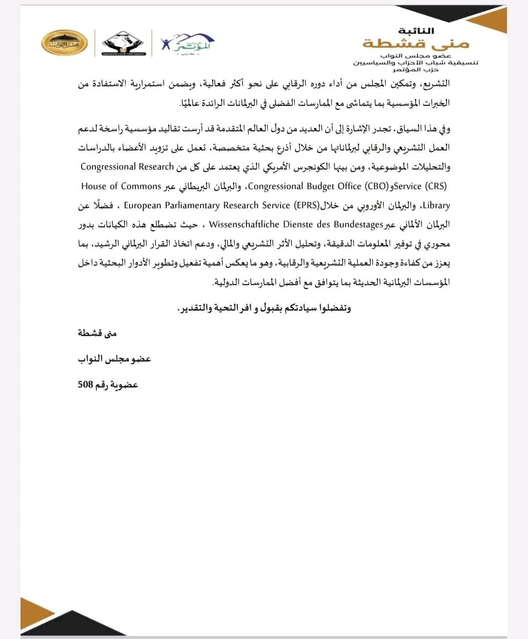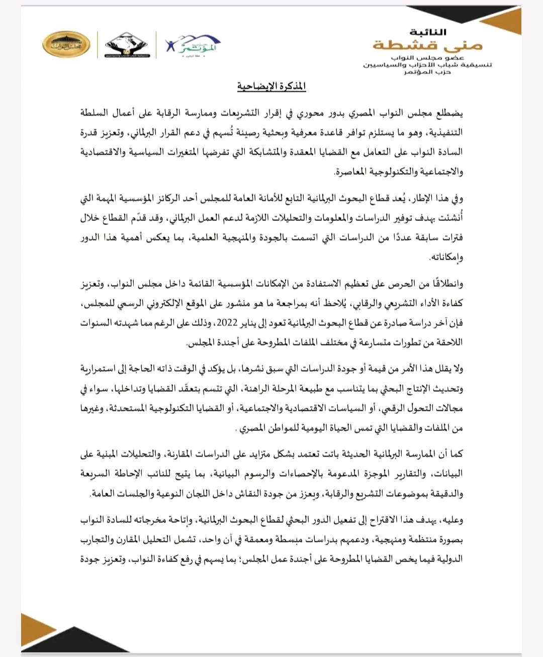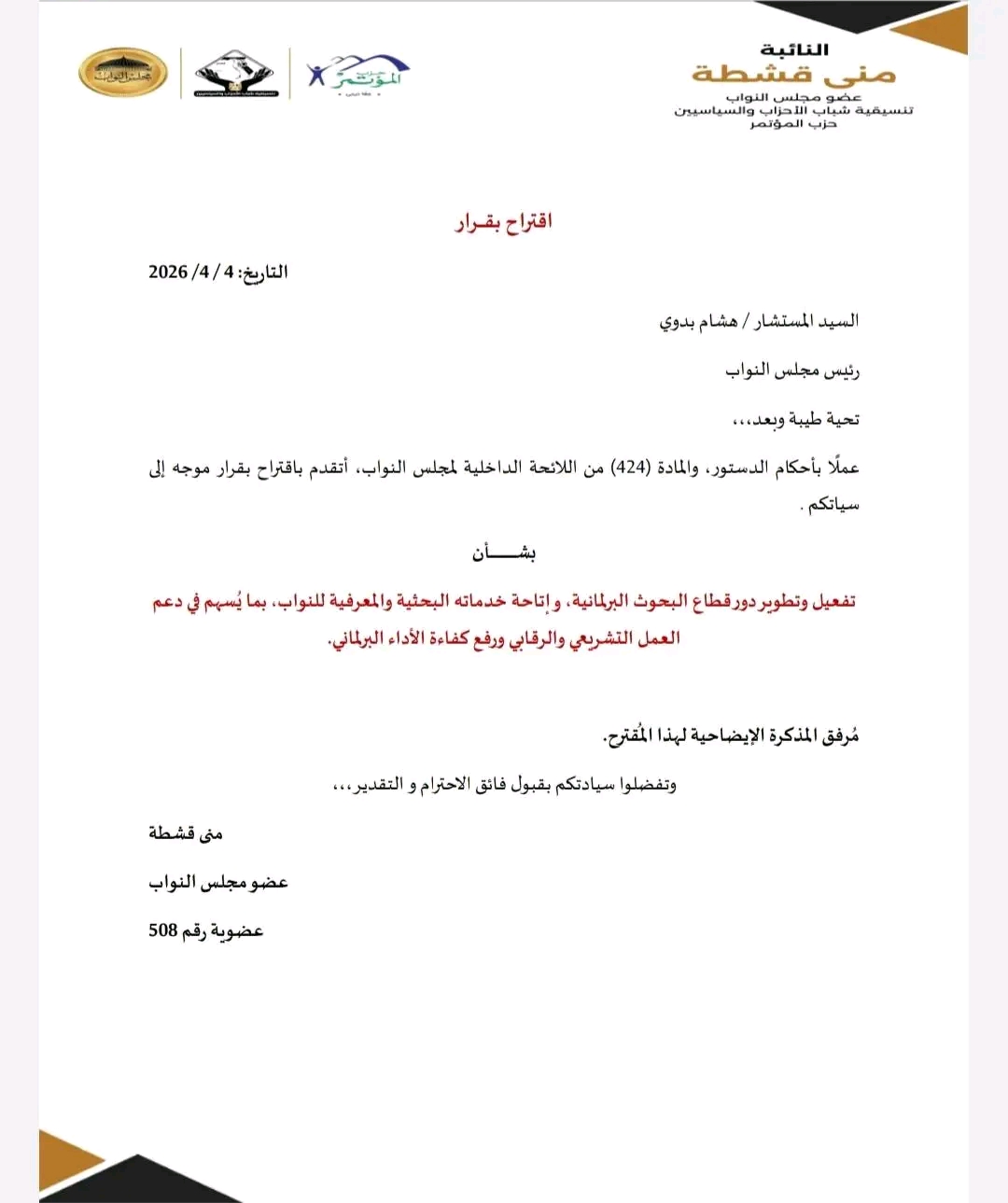 تقدمت النائبة منى قشطة، عضو مجلس النواب، باقتراح بقرار إلى المستشار هشام بدوي رئيس المجلس، بشأن تفعيل وتطوير دور قطاع البحوث البرلمانية وإتاحة خدماته البحثية والمعرفية للنواب بصورة منتظمة، بما يسهم في دعم العمل التشريعي والرقابي ورفع كفاءة الأداء البرلماني.