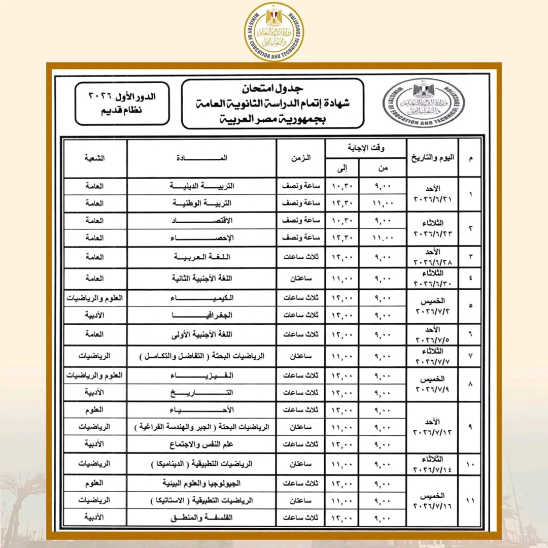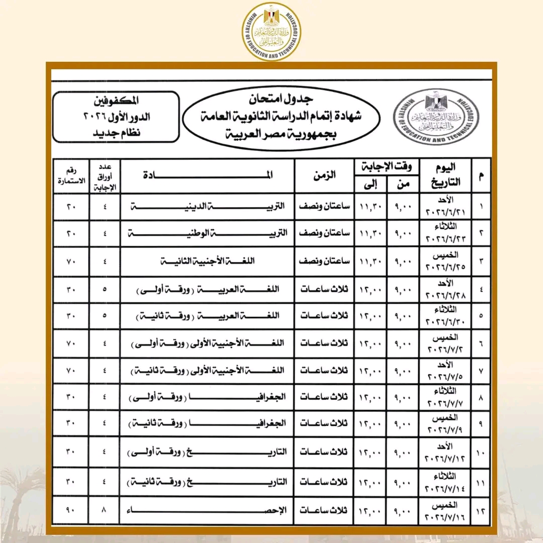 وأكدت الوزارة أن امتحانات الدور الأول للثانوية العامة بجميع أنظمتها (الجديد – القديم) وطلاب المكفوفين ستنطلق يوم الأحد 21 يونيو 2026، وتستمر حتى يوم الخميس 16 يوليو 2026، وفق الخطة الزمنية المعتمدة للعام الدراسي.