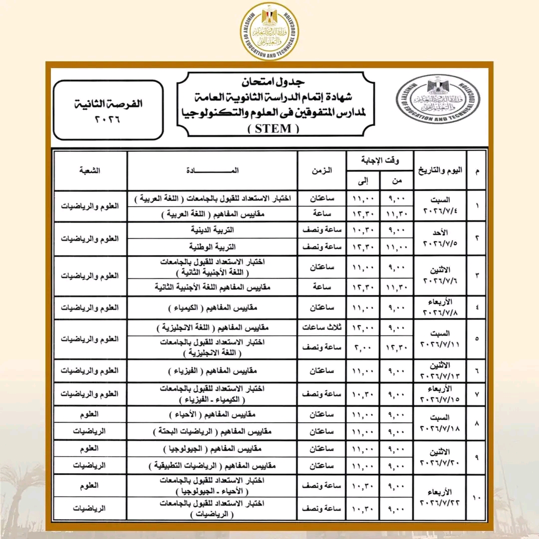 وفيما يخص مدارس المتفوقين في العلوم والتكنولوجيا (STEM)، أوضحت الوزارة أن امتحانات الفرصة الأولى تبدأ يوم 16 مايو 2026 وتنتهي يوم 20 يونيو 2026، بينما تُعقد امتحانات الفرصة الثانية اعتبارًا من يوم السبت 4 يوليو 2026 وحتى يوم 22 يوليو 2026.