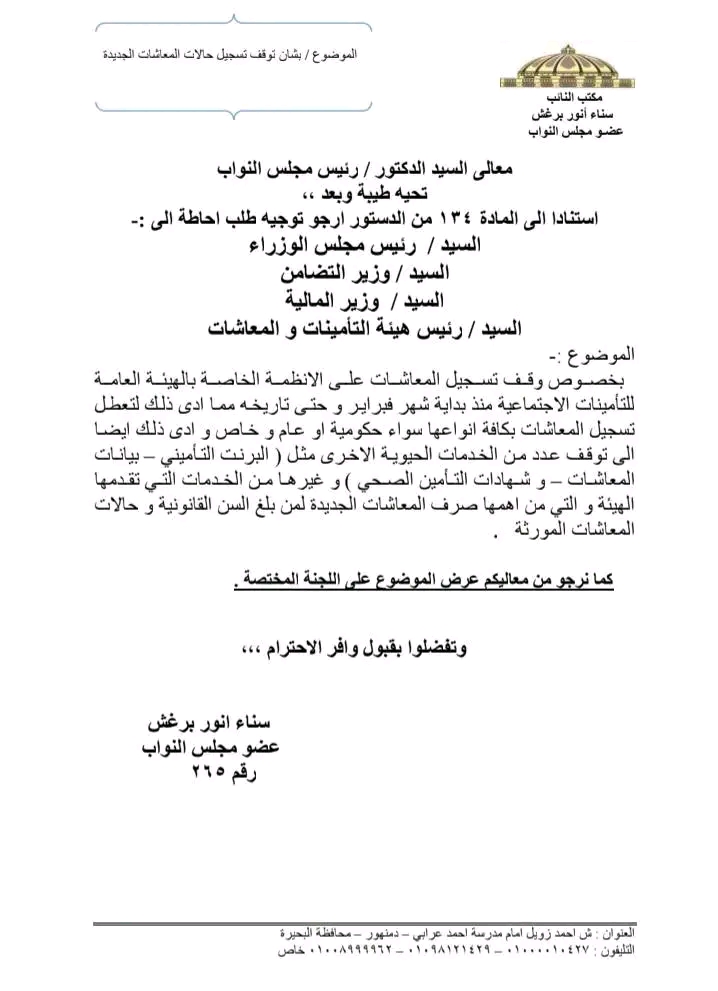 تقدّمت النائبة سناء برغش بطلب إحاطة موجّه إلى الدكتور رئيس مجلس الوزراء، واللواء رئيس الهيئة القومية للتأمينات والمعاشات، وعدد من الجهات المعنية، بشأن ما وصفته بتوقف منظومة تسجيل المعاشات منذ فترة، وهو ما ترتّب عليه تعطل صرف المستحقات لعدد من المواطنين الذين أنهوا مدة خدمتهم، إضافة إلى تأثر حالات المعاشات الموروثة وعدد من الخدمات التي تقدمها الهيئة.