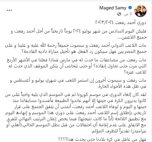 شن رئيس نادي وادي دجلة ماجد سامي هجوماً قوياً على حسابه على فيسبوك على منظومة الكرة المصرية بعد وفاة اللاعب أحمد رفعت.