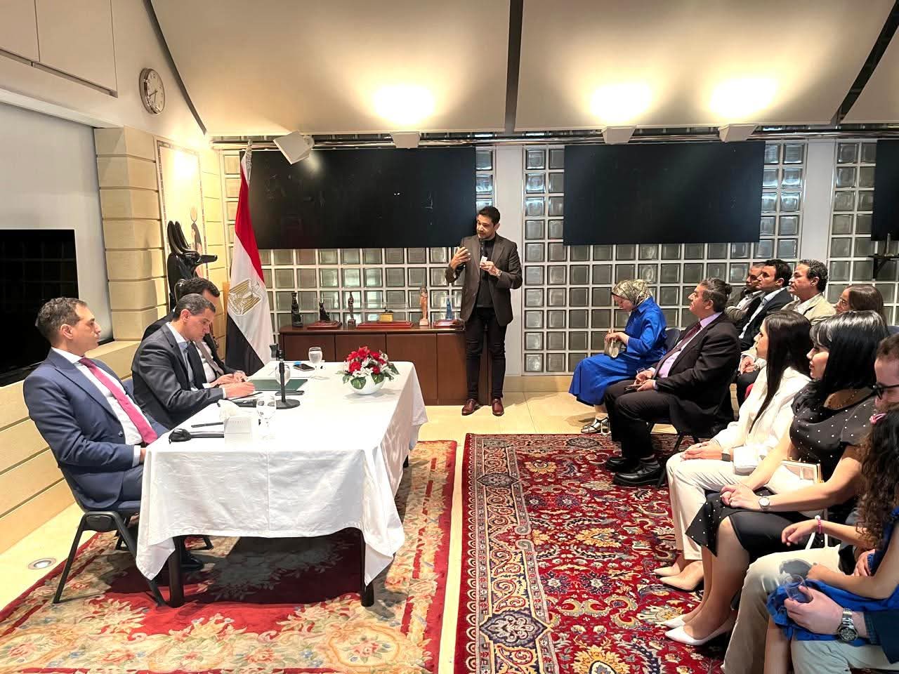 استعرض السفير “الإتربي” كذلك المبادرات التي أطلقتها وزارة الخارجية والهجرة وشئون المصريين بالخارج، بما فيها تلك التي تم الإعلان عنها عقب مؤتمر المصريين بالخارج في أغسطس 2025، كمبادرات “بيتك في مصر”، و”افتح حسابك في مصر”، و”مزرعتك في مصر”، و”تأمينك في مصر”، و”مدرستك في مصر”، وهي المبادرات التي تهدف بالأساس لتعزيز علاقة المصريين بالخارج بالوطن الأم.