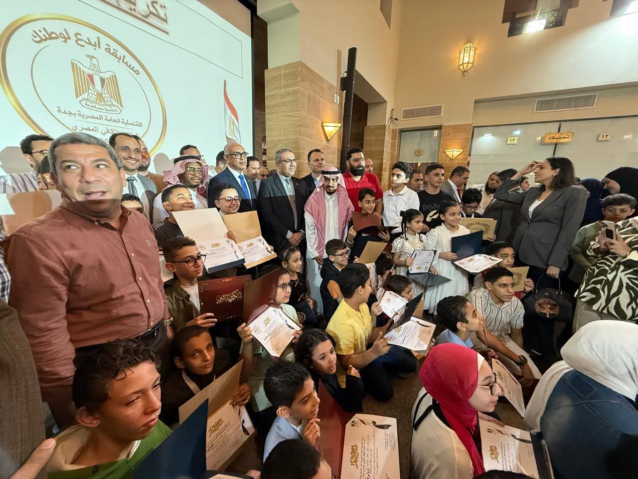 تكريم ابناء الجالية المصرية في نطاق عمل وبرعاية القنصلية العامة لجمهورية مصر العربية بجدة والفائزين في مسابقة “ابدع لوطنك” في مجال الرسم والشعر و الفيديوهات الترويجية عن مصر و ذلك تحت إشراف و تنفيذ المكتب الثقافي المصري بجدة مساء اليوم الأربعاء الموافق 7 يناير 2026 بمقر القنصلية المصرية العامة والمكتب الثقافي المصري بجده.