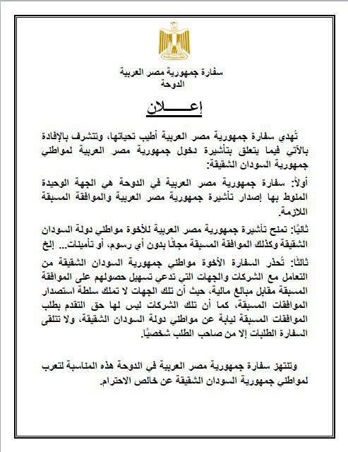 أفادت سفارة جمهورية مصر العربية في الدوحة، بأنه فيما يتعلق بتأشيرة دخول جمهورية مصر العربية لمواطني جمهورية السودان الشقيقة،فإن سفارة مصر في الدوحة هي الجهة الوحيدة المنوط بها إصدار تأشيرة جمهورية مصر العربية والموافقة المسبقة اللازمة.