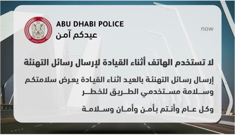 دعت القيادة العامة لشرطة أبوظبي، السائقين إلى عدم إرسال رسائل تهنئة العيد خلال قيادة مركباتهم على الطرق؛ حفاظاً على سلامتهم وسلامة مستخدمي الطريق.