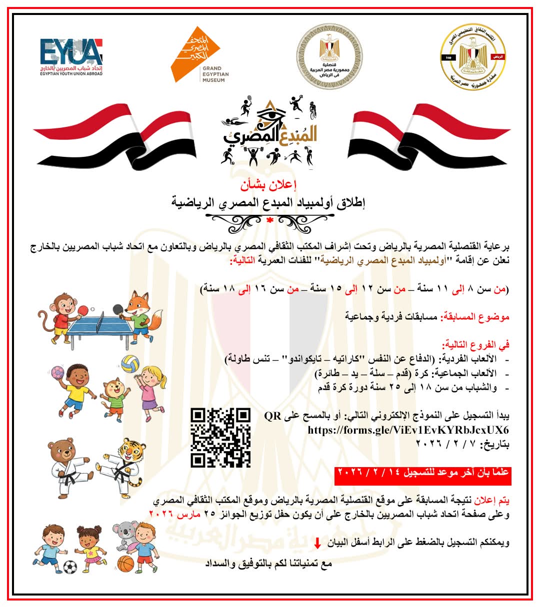 تحت رعاية القنصلية المصرية بالرياض، وبإشراف المكتب الثقافي التعليمي المصري بالرياض، وبالتعاون مع اتحاد شباب المصريين بالخارج، تم الإعلان عن بدء “أولمبياد المبدع المصري الرياضية”، وهي النسخة الرياضية المنتظرة التي تأتي استكمالاً للمبادرة الكبرى التي انطلقت بمسارها الثقافي مطلع العام الجاري.