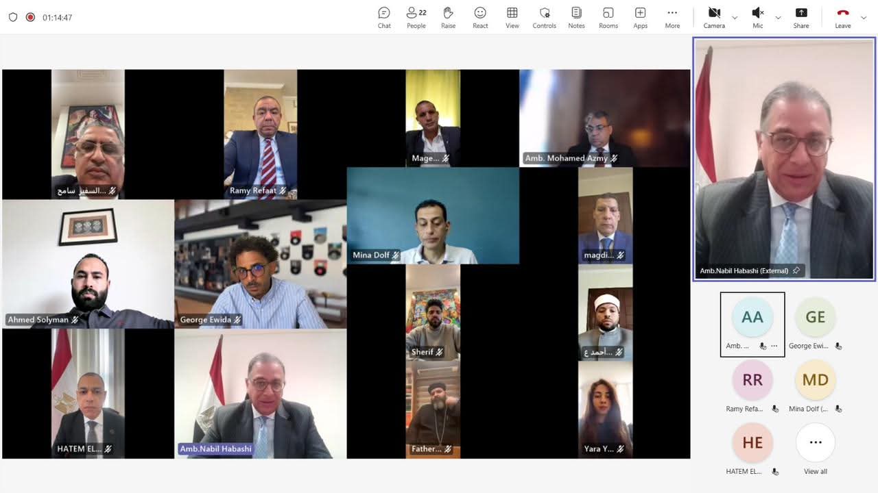 تناول اللقاء أيضا خطوات تطوير منظومة العمل القنصلي، ولاسيما ما يتعلق بالتحول الرقمي للخدمات القنصلية، حيث اكد نائب وزير الخارجية أن الوزارة تضع تبسيط الإجراءات وتسريع وتيرة تقديم الخدمات على رأس أولوياتها، من خلال التنسيق المستمر مع الجهات الوطنية المعنية، بما يسهم في تلبية احتياجات المصريين في الخارج وتعزيز مستوى رضاهم عن الخدمات المقدمة. وفي سياق متصل، شدد السفير حبشي على أن رعاية المصريين بالخارج تأتي في صدارة أولويات الدولة، موضحاً أن الوزارة عملت على تطوير منظومة متكاملة لقنوات التواصل عبر مختلف منصات التواصل الاجتماعي، إلى جانب آليات حديثة للتفاعل المباشر، من بينها اللقاءات الافتراضية الدورية والصالون الثقافي الذي أطلقته الوزارة مؤخراً.